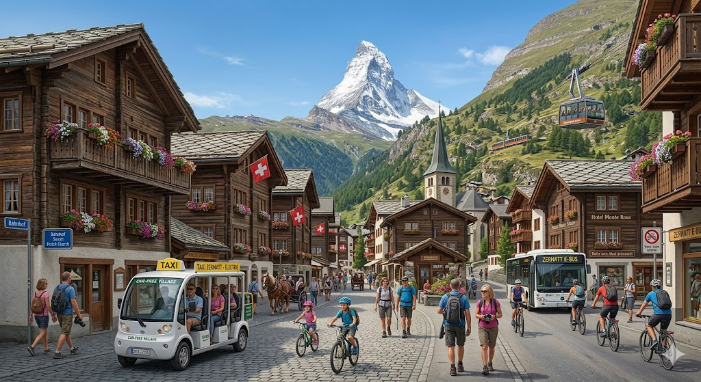 Salah satu hal yang membuat Zermatt berbeda dari kebanyakan kota wisata lainnya adalah kebijakan uniknya sebagai desa bebas mobil. Kendaraan berbahan bakar bensin tidak diperbolehkan masuk ke kawasan ini, sehingga suasana desa tetap tenang, bersih, dan ramah lingkungan.