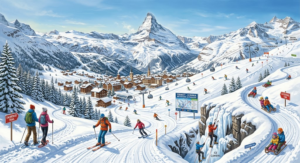 Musim ski di Zermatt sangat panjang karena adanya gletser tinggi yang memungkinkan aktivitas ski bahkan di musim panas. Para pengunjung dapat menikmati berbagai aktivitas musim dingin seperti:
