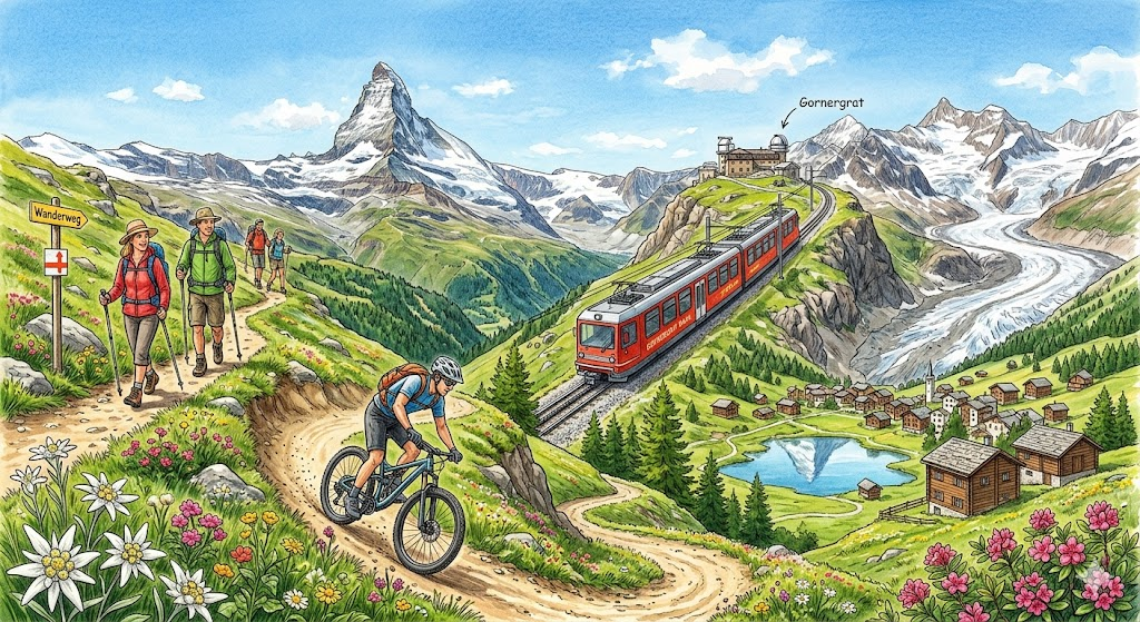 Walaupun terkenal sebagai destinasi musim dingin, Zermatt juga menawarkan berbagai aktivitas menarik di musim panas. Ketika salju mencair, kawasan Alpen berubah menjadi hamparan padang rumput hijau dengan bunga liar yang indah.